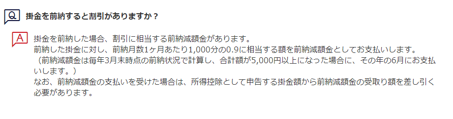 前納した掛金に対し、前納月数1ヶ月あたり1,000分の0.9に相当する額を前納減額金として受け取ることができます。