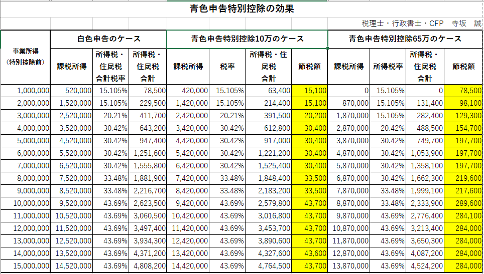 黄色のマーキングの個所が、白色申告のケース(青色申告特別控除は0円)と比較した場合の節税額です。