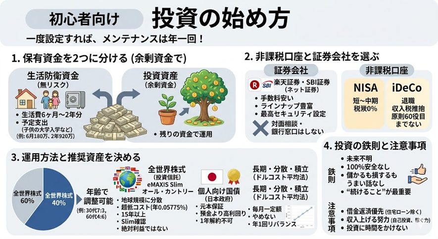※右肩上がりの相場では一括投資の方が有利な場合もあるが、初心者は継続しやすい積立投資を優先する。